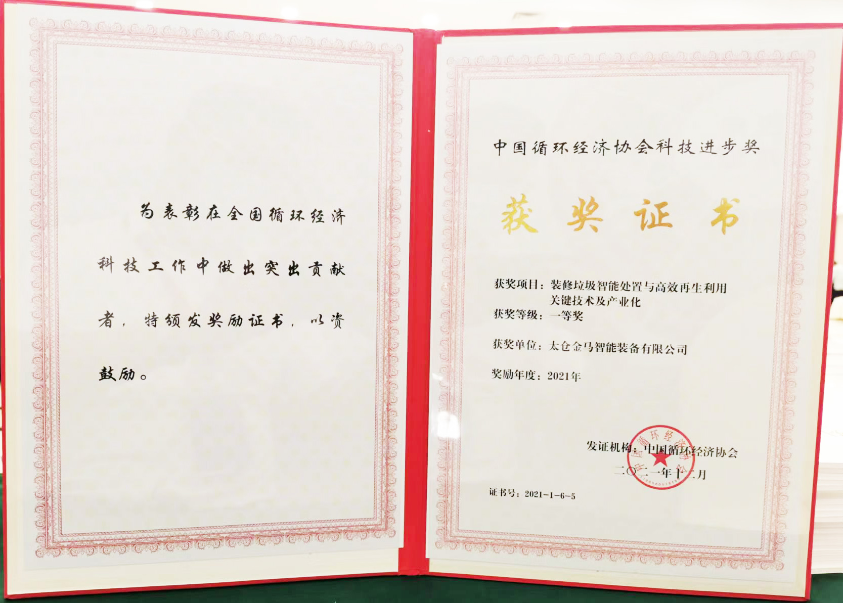On July 28, 2022, at the 2021 China Circular Economy Association Science and Technology Award Ceremony, the "Key Technologies and Industrialization of Intelligent Disposal and Efficient Recycling of Decoration Waste" project participated in the research and development of Goldenma (Parent company of Vancen ) stood out from more than 90 technological achievements with its leading advantages in scientific and technological innovation, and won the honor of "First Prize of Science and Technology of China Circular Economy Association"!